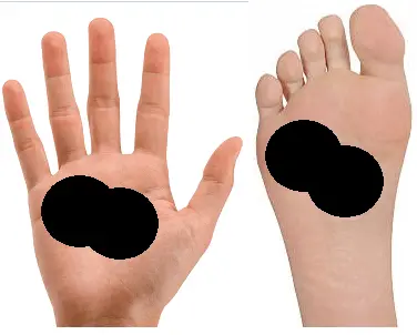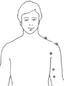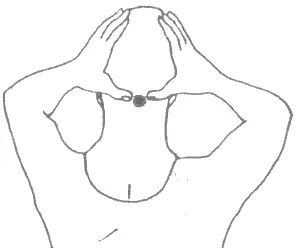 छोटी अँगुलियों के ऊपर (आकृति नं० 3) तथा बाजुओं के ऊपर दिखाये इन केन्द्रों पर 5-7 सेकंड प्रति केन्द्र, तीन बार प्रेशर देना चाहिए। छोटी अँगुली के ऊपर दर्शाये केन्द्र पर प्रेशर हाथ के अँगूठे से बाहर की ओर देना चाहिए ।